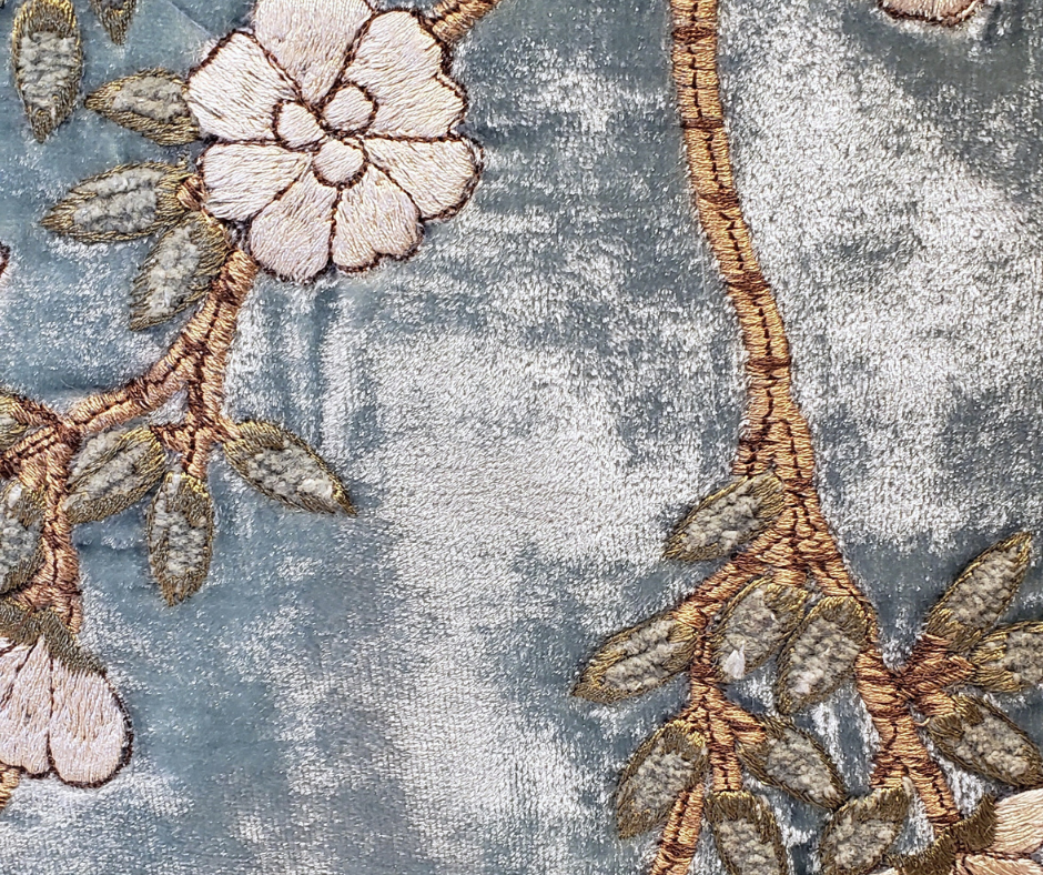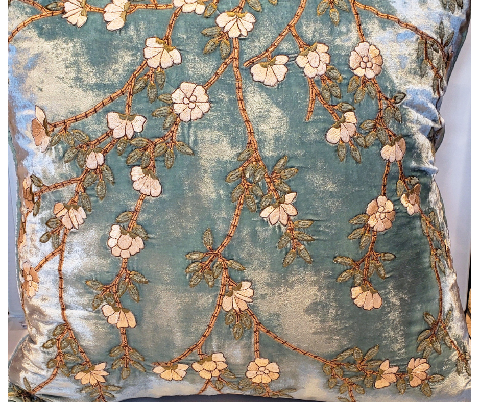 Luxury Anke Drechsel Tuileries silk velvet cushion in Ocean, 40×40 cm (15.7×15.7 in). Hand-dyed and embroidered in India, filled with a soft down insert for ultimate comfort and elegance.