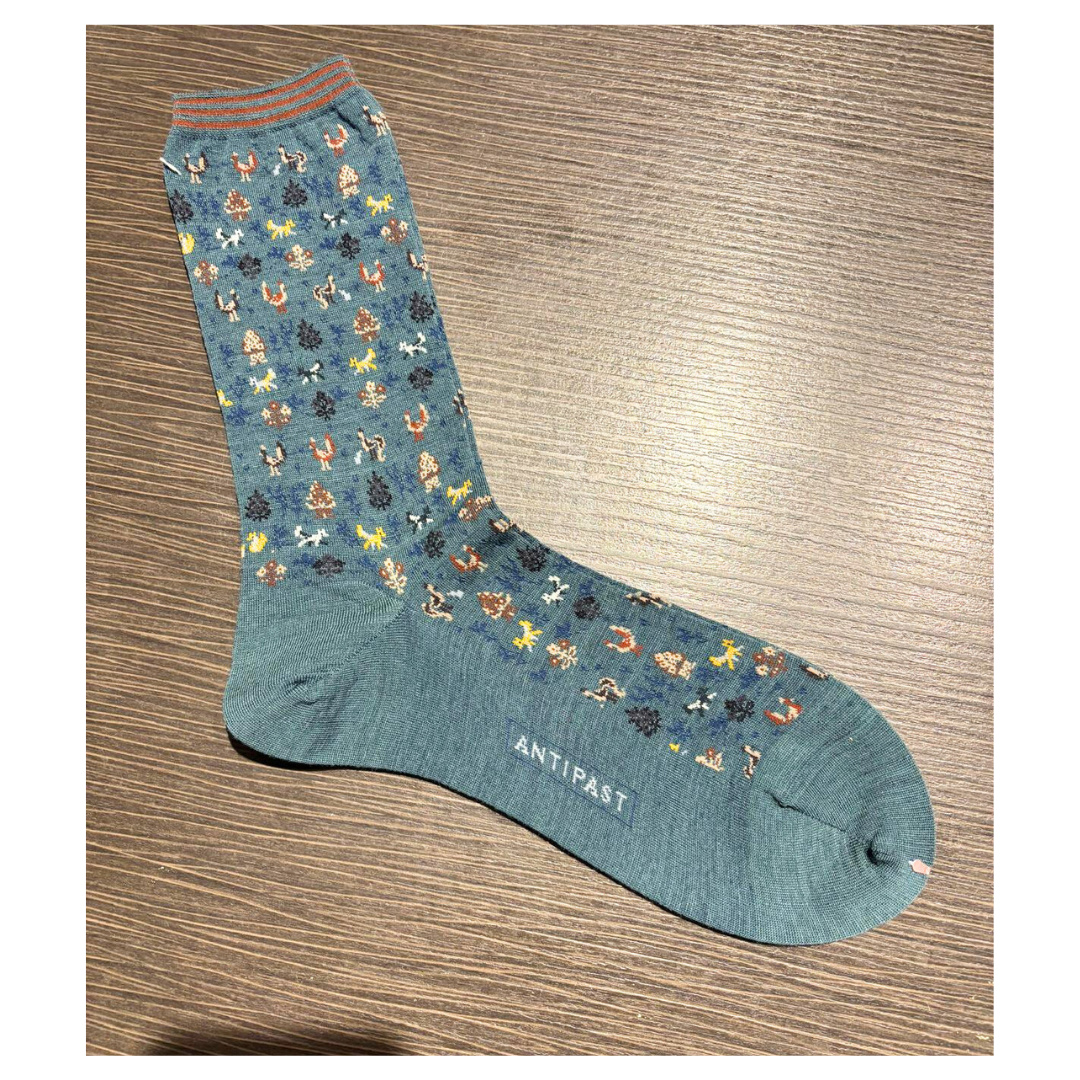 The Antipast Forest Mate socks feature woodland-inspired motifs. A rich, whimsical knit with beautiful depth. Designed and made in Japan.
