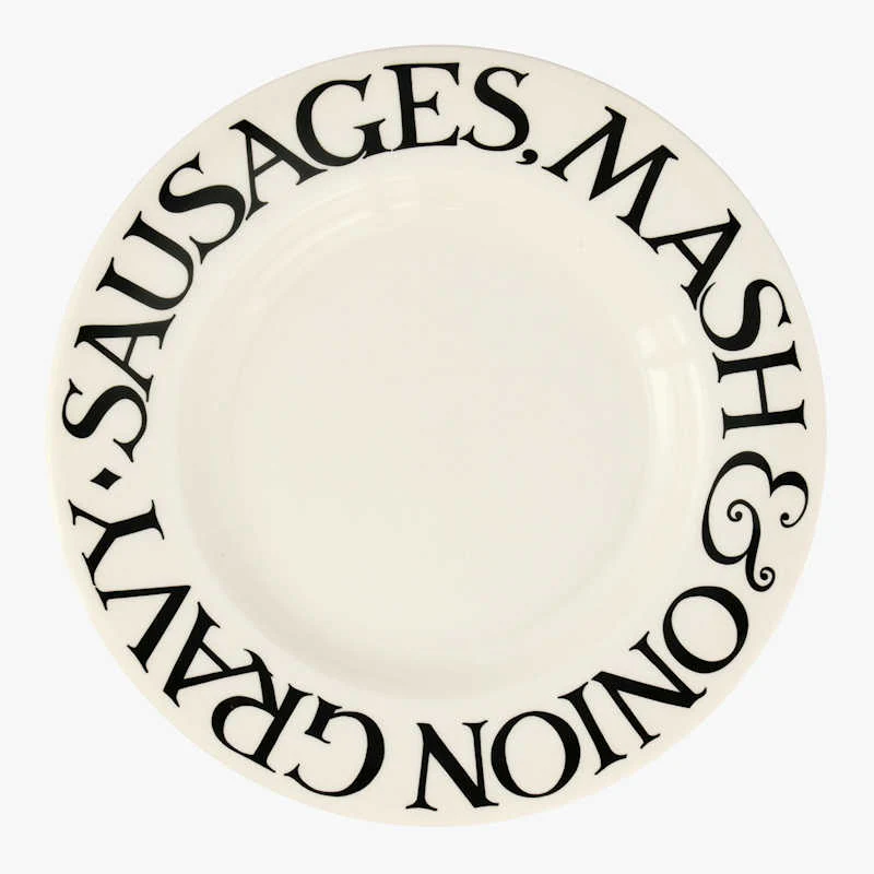The Emma Bridgewater Black Toast ‘Sausage & Mash’ 10.5" Dinner Plate is a playful nod to a classic comfort dish, with Sausage & Mash and Onion Gravy written around the rim. Part of the Toast & Marmalade collection.