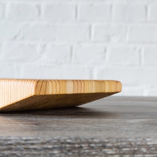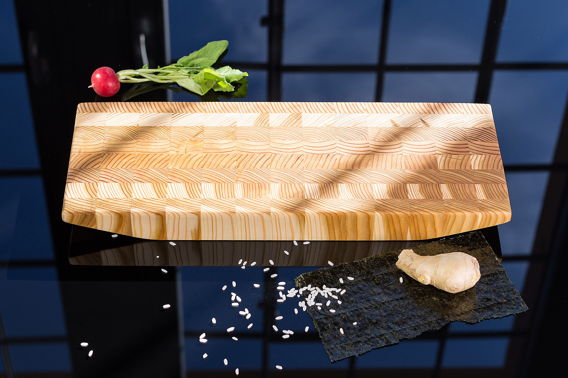 Larch Wood’s small “Ki” presentation board draws on Japanese style and clean design. Ideal for serving sushi and small appetizers, it blends elegance and function in a sturdy end-grain build. Size: 16" x 6.25" x 1.5".