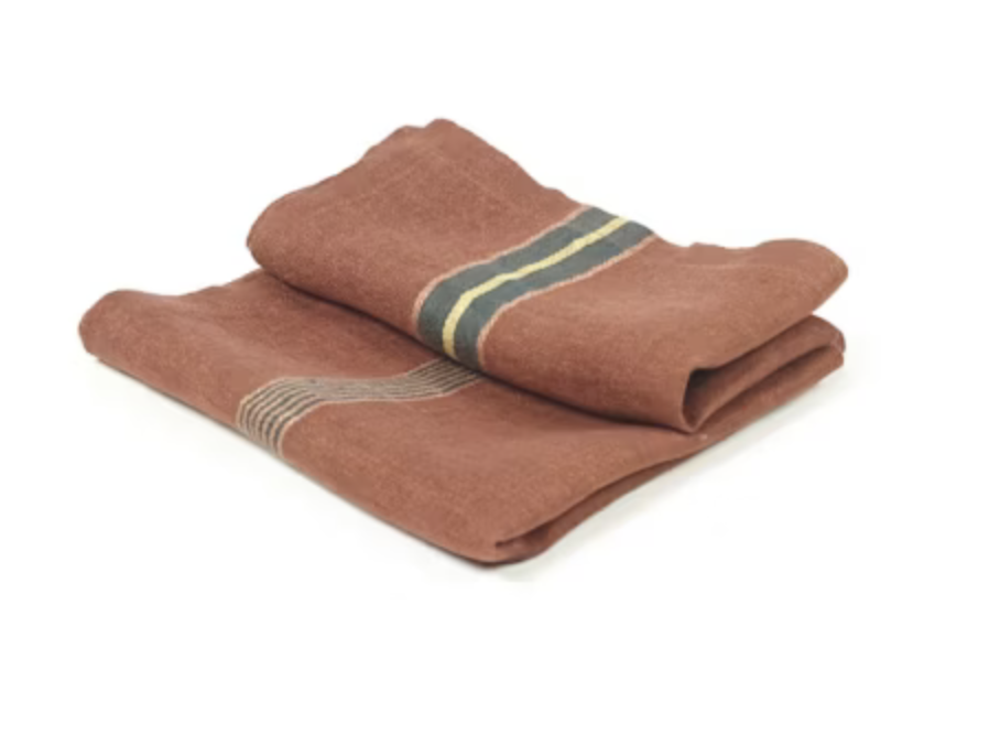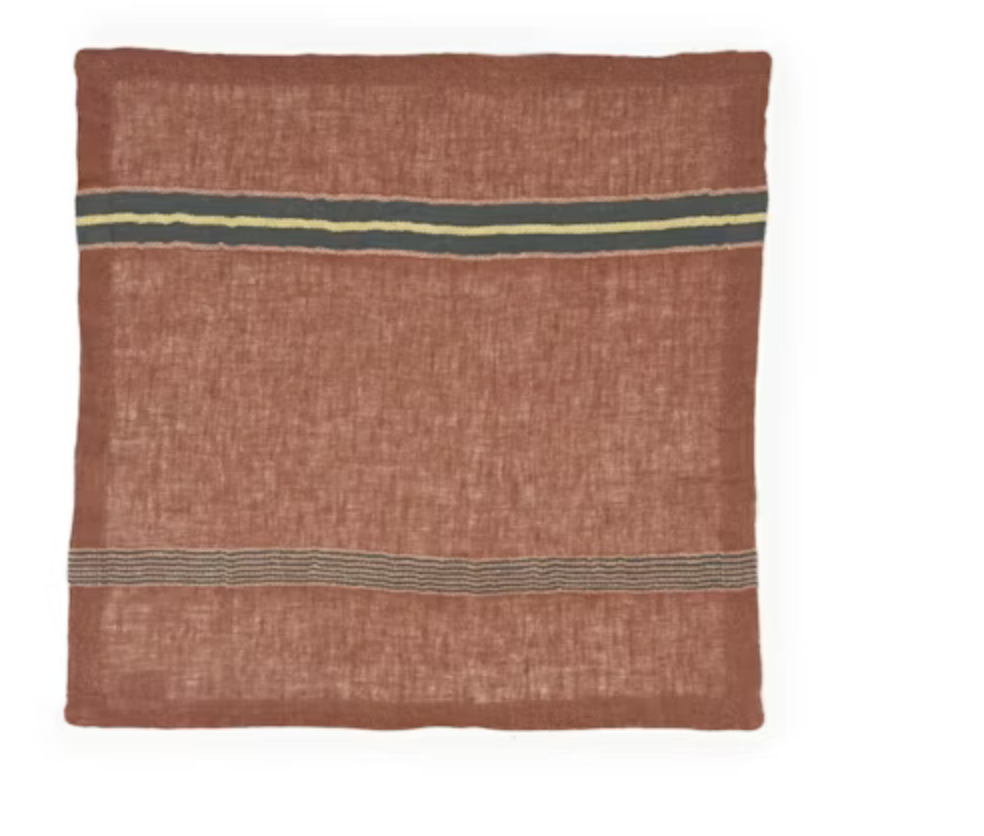 The Libeco Banff Stripe Napkin (16.5" x 16.5") features evergreen, mustard, and old rose stripes on a mahogany linen ground. Its warm tones and premium craftsmanship add timeless style to any table.