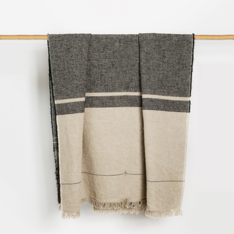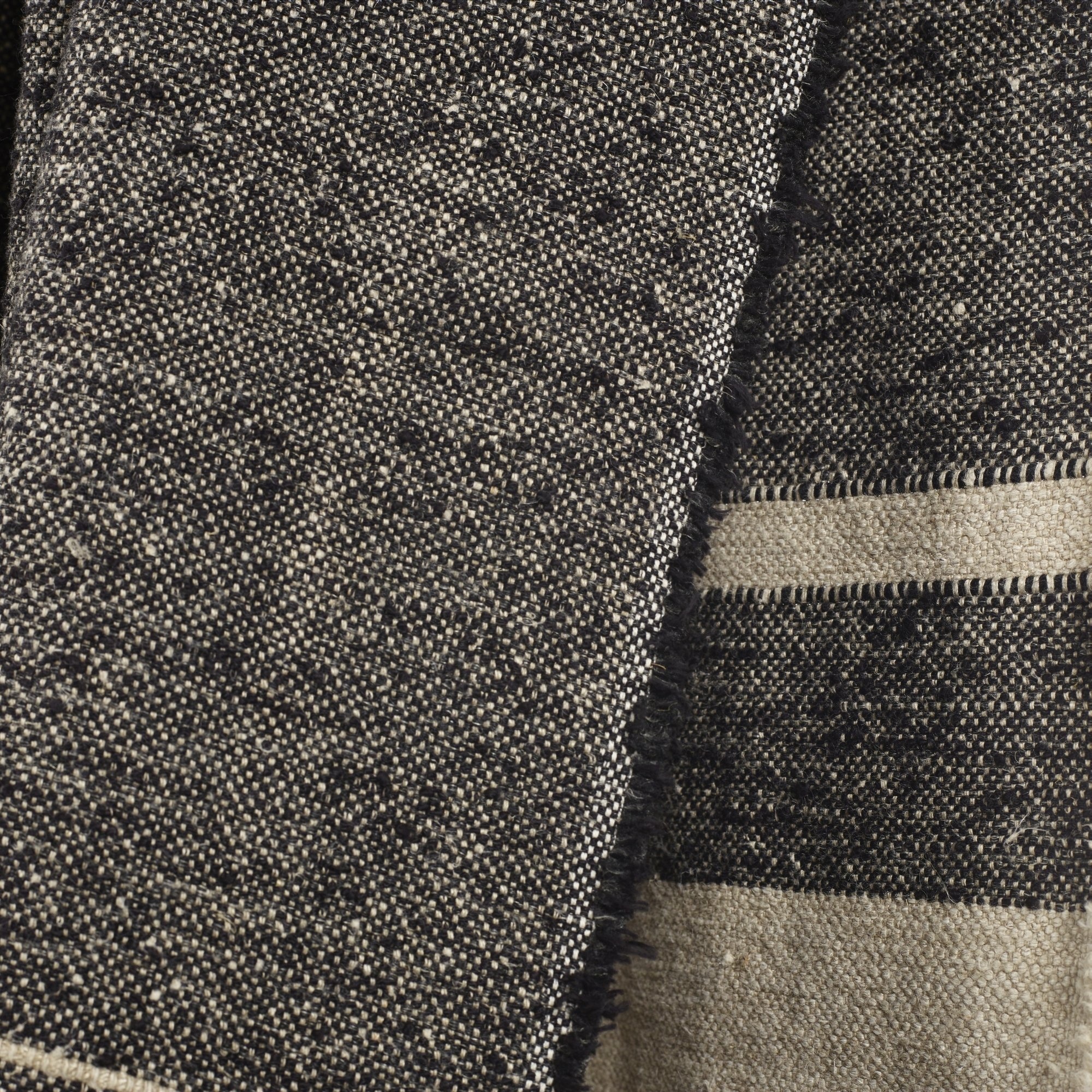 The central section of this throw is a black/flax plain weave construction, while the top end is a black/flax small stripe and the bottom end is solid flax with a single black stripe. Both ends are finished with a flax fringe.