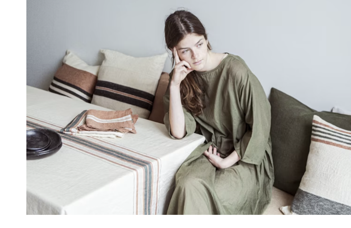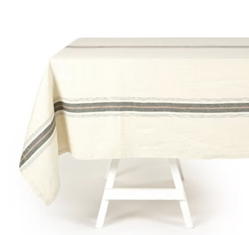 The Libeco Gypsum Stripe Tablecloth (69" x 69") features a modern twill weave with sage, old rose, and black stripes on an ecru ground. Made from 100% linen, it adds timeless elegance and mixes beautifully with Mojave napkins.