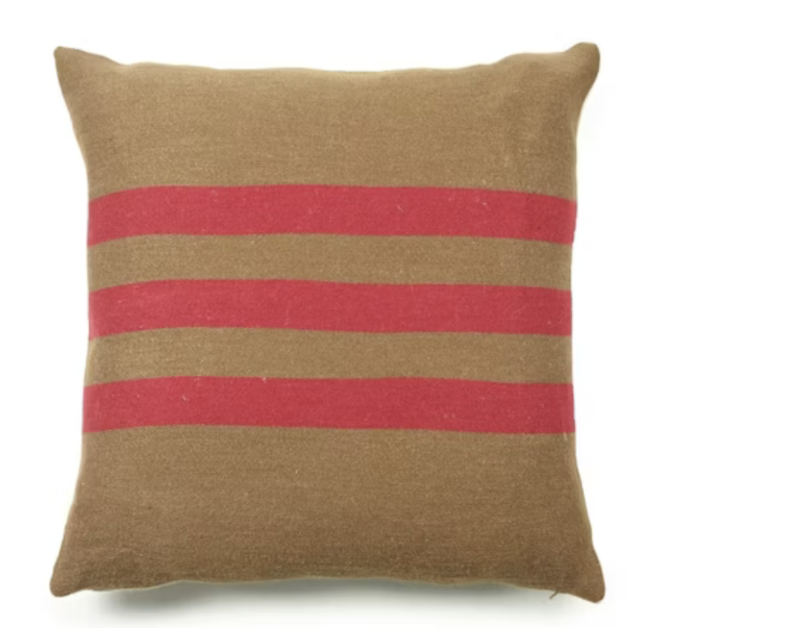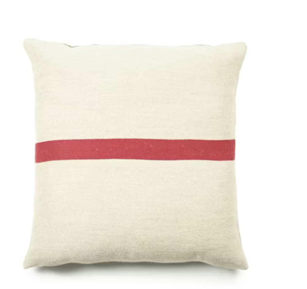The Manitoba Pillow Cover (25" x 25") features a neutral base accented with a bold red stripe. Made from a washed linen-wool blend, it offers rich texture, warmth, and timeless rustic charm. 70% linen, 30% wool.
