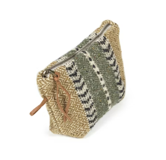 The Libeco Montana Pouch in Gold (9" x 6") features a rich herringbone and plain weave mix. Washed for softness and texture, its gold, beige, olive, and black stripes make it a stylish winter essential.