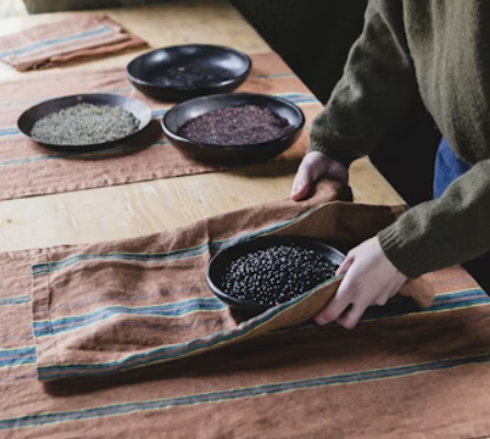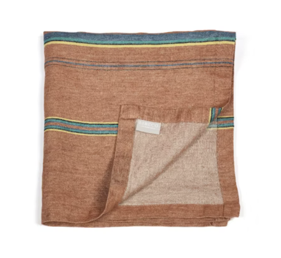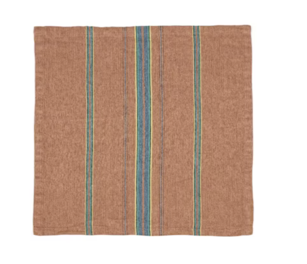 The Libeco Ontario Napkin (21" x 21") features multicolored green, blue, yellow, and black stripes on a terracotta herringbone base. Made from 100% stonewashed linen for a soft, timeless finish.