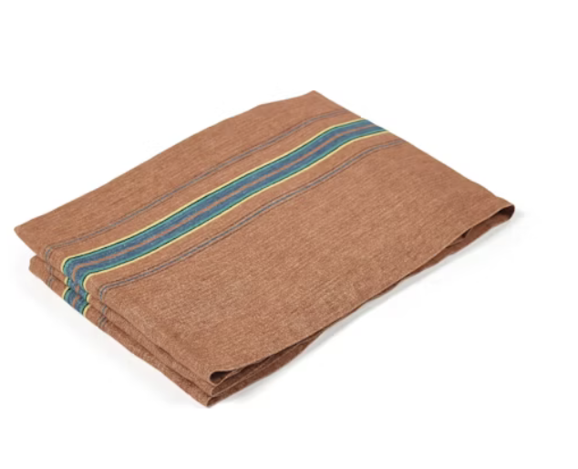 The Libeco Ontario Table Runner (21" x 59") features green, blue, yellow, and black stripes on a terracotta herringbone weave. Crafted from 100% stonewashed linen, it adds warmth and texture to autumn tables.
