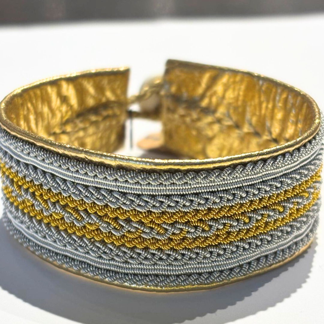The Athena Wide Gold bracelet features an intricate mix of nine silver-pewter braids set on rich reindeer leather and a horn button closure. Sustainably made in collaboration with the Sámi tribe.