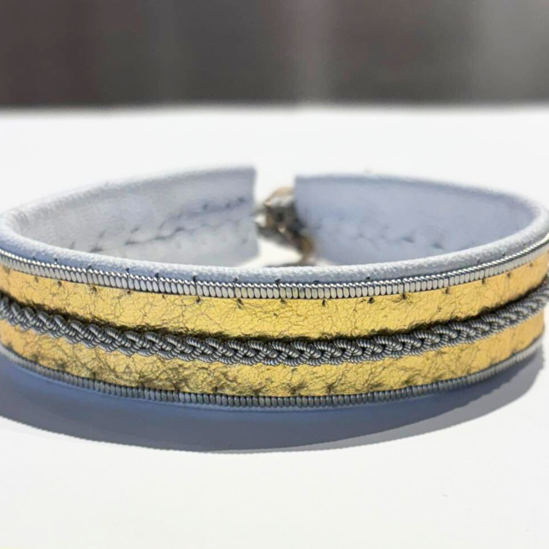 The Empire White/Gold bracelet features a slim silver-pewter braid on soft reindeer leather, finished with a gold accent and a horn button closure. Sustainably made in collaboration with the Sámi tribe.