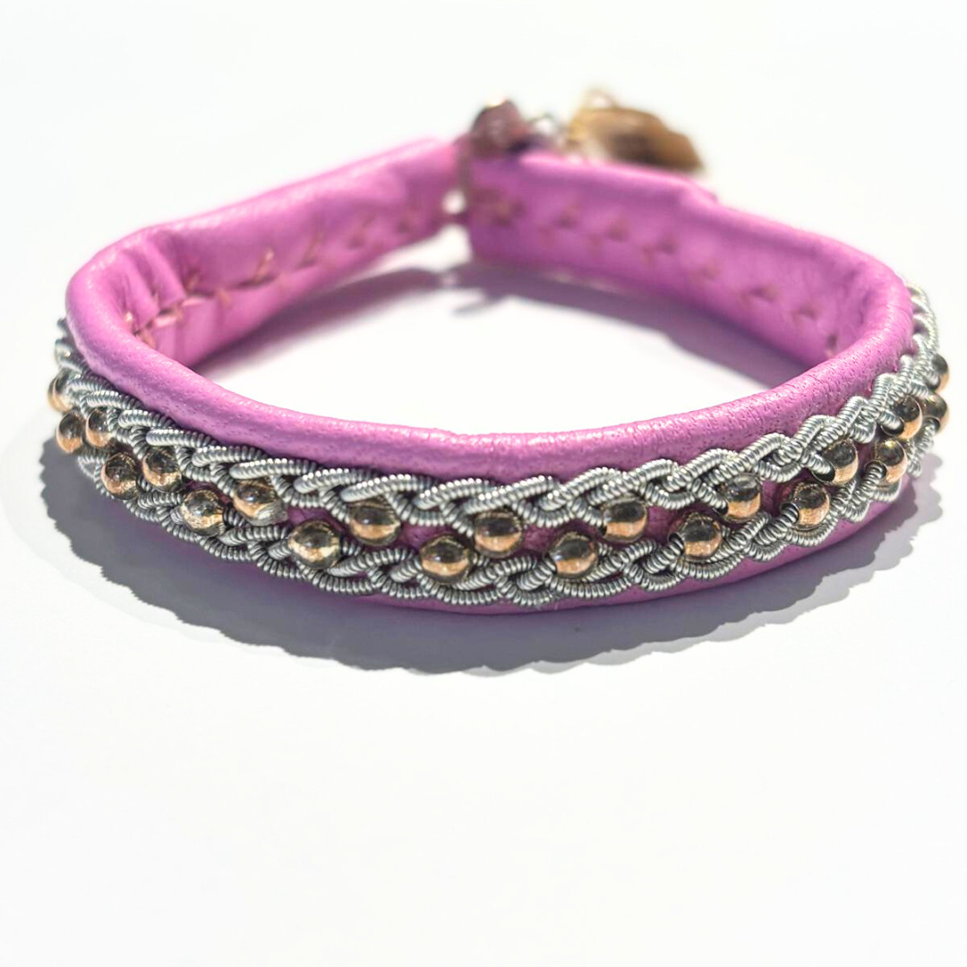 The Pink Cosmos bracelet features two rows of braided silver-pewter embroidery with delicate bead accents on soft reindeer leather with horn button closure, a bold yet refined nod to Sámi craftsmanship.