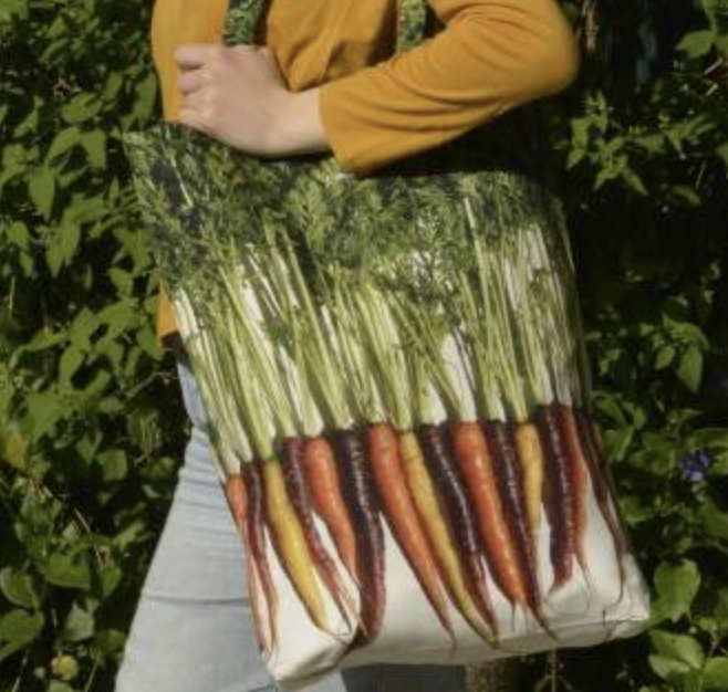Printed with vibrant photos of freshly harvested carrots lined up in all their orange, yellow, and purple glory, this tote brings a farmer’s market vibe wherever you go. Made in France from recycled plastic bottles. Size: 19" x 14" x 2.5"