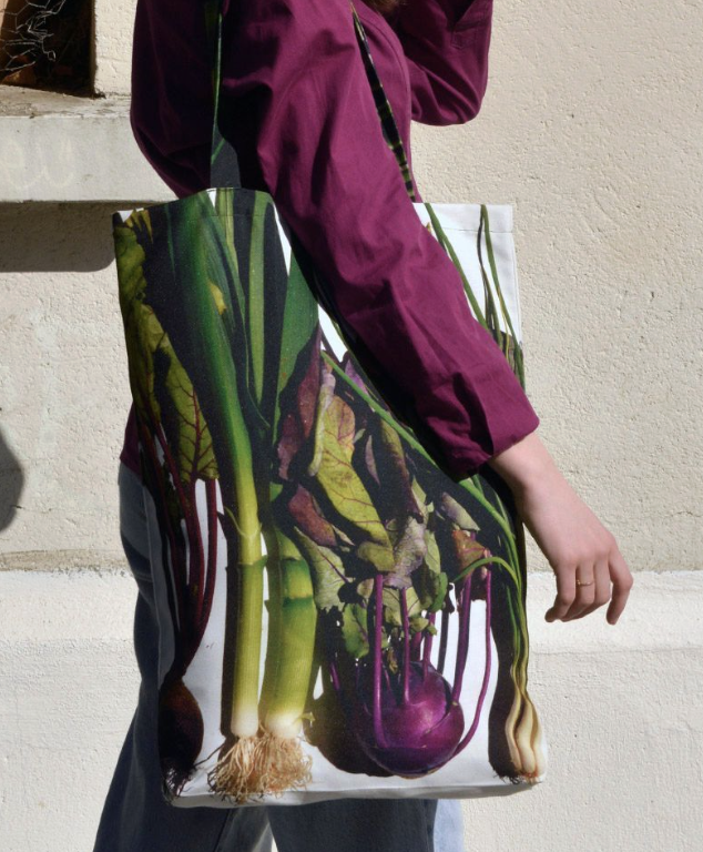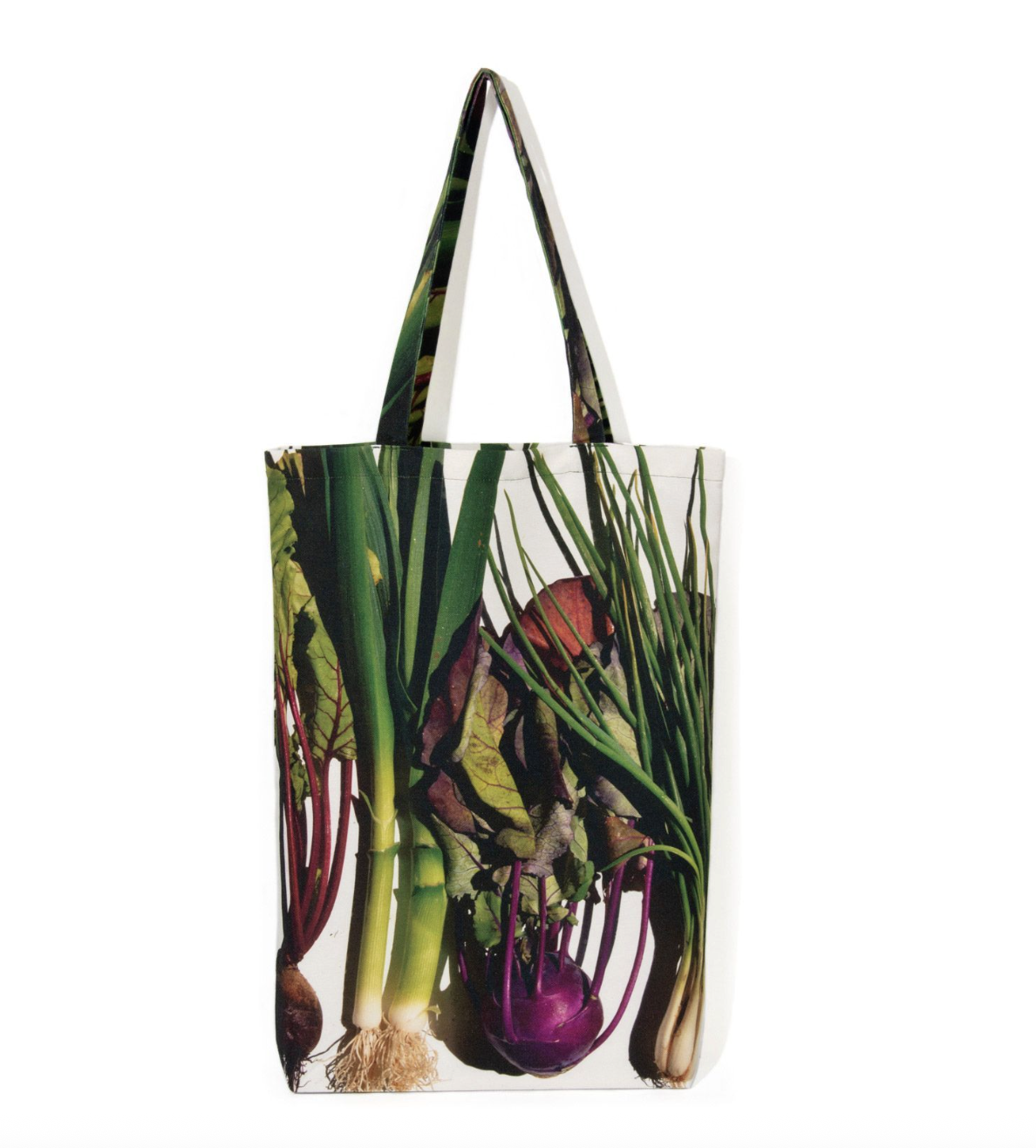A 19" French market tote made from recycled plastic bottles and printed with bright veggies. Roomy, washable, and eco-friendly—great as a hostess gift, or a fun treat for yourself. Perfect for farmers’ market mornings. Size: 19" x 14" x 2.5"