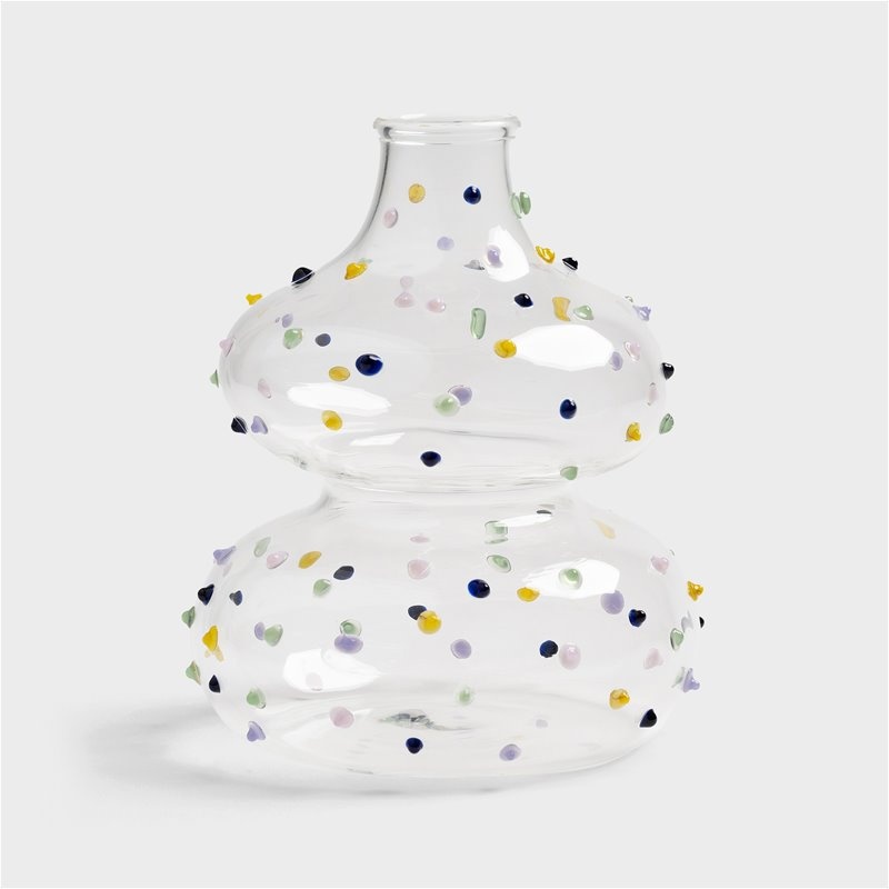 Add a playful pop of colour to any space with this charming mini vase. Made from solid glass with raised dots for added texture. Perfect for displaying small flowers, single stems, or simply as a decorative accent. Size: 3.5″ × 4″ × 5.7″