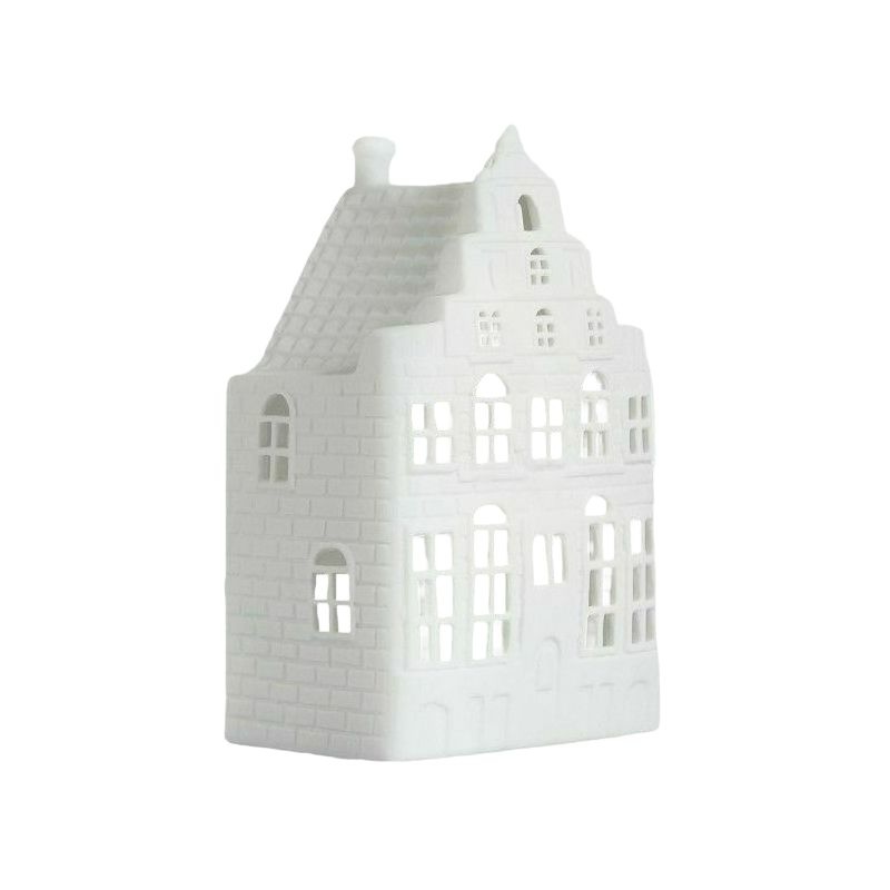 Bring a little Amsterdam charm into your home with this tall porcelain canal house tea light holder. Once lit, the soft glow shines through its tiny windows. Beautiful on a mantel, shelf, or holiday table.