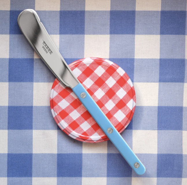 The Sabre Paris Bistro Butter Knife in Pastel Blue pairs durable stainless steel with a classic riveted acrylic handle. Made in France, it adds charm and ease to spreading butter, jams, and soft cheeses.