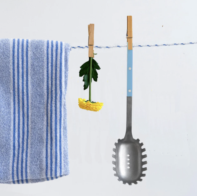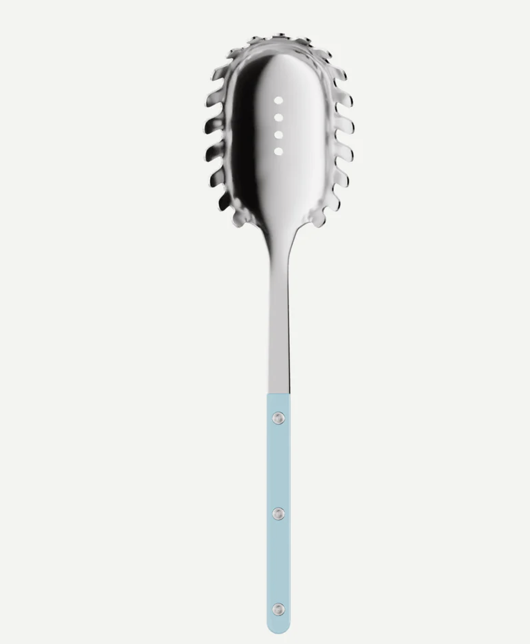 The Sabre Paris Bistro Spaghetti Spoon in Pastel Blue combines durable stainless steel with a classic riveted acrylic handle. Made in France, it brings charm and ease to serving pasta.