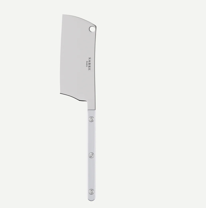 The Sabre Paris Pearly White Cheese Cleaver features durable stainless steel paired with a glossy pearly acrylic handle. Made in France, it’s perfect for slicing and serving firm or semi-hard cheeses in style.