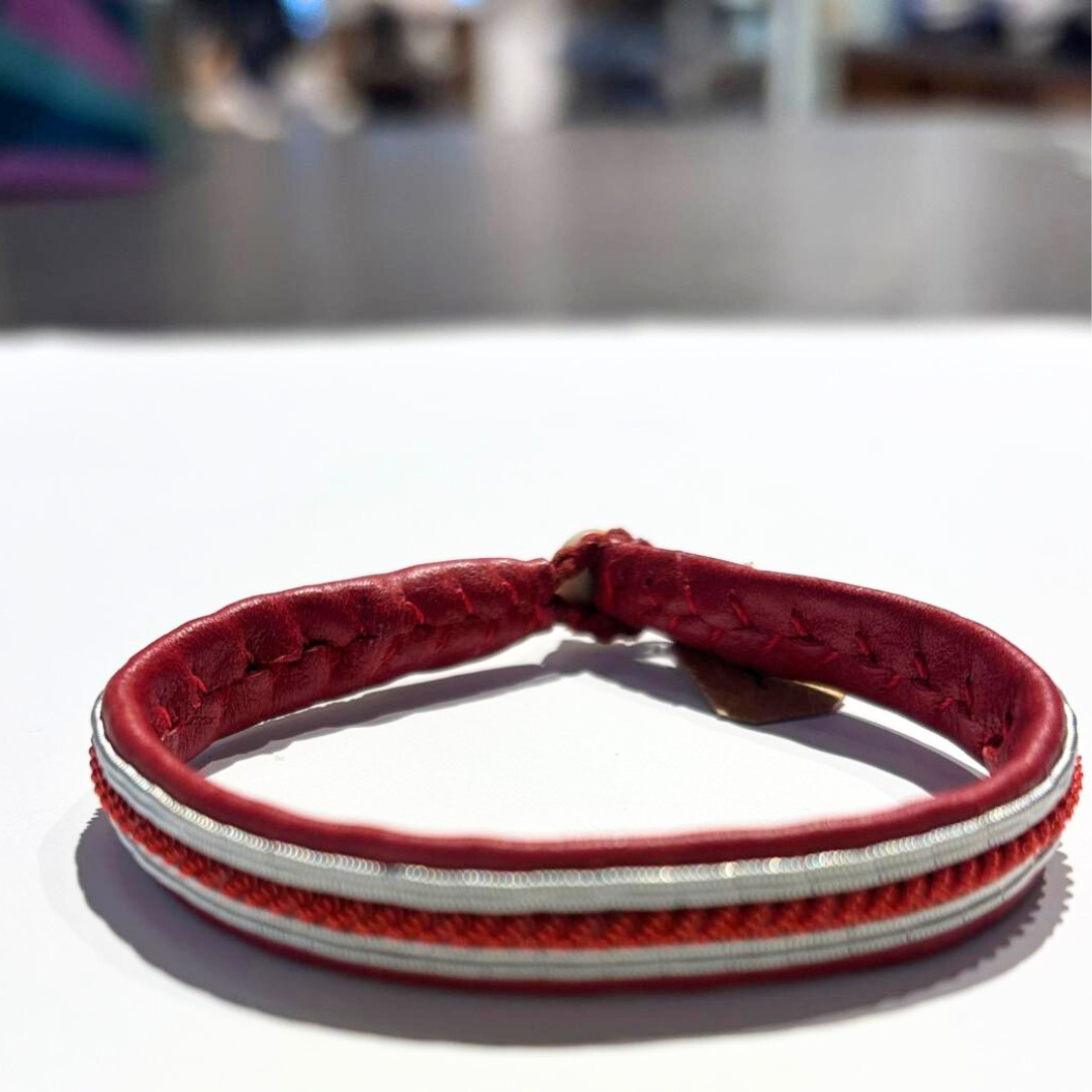 The Ada Red/Red bracelet features two rows of silver-pewter braids on rich reindeer leather with a horn button closure. Handcrafted in collaboration with Sámi artisans, it’s a striking piece rooted in tradition.