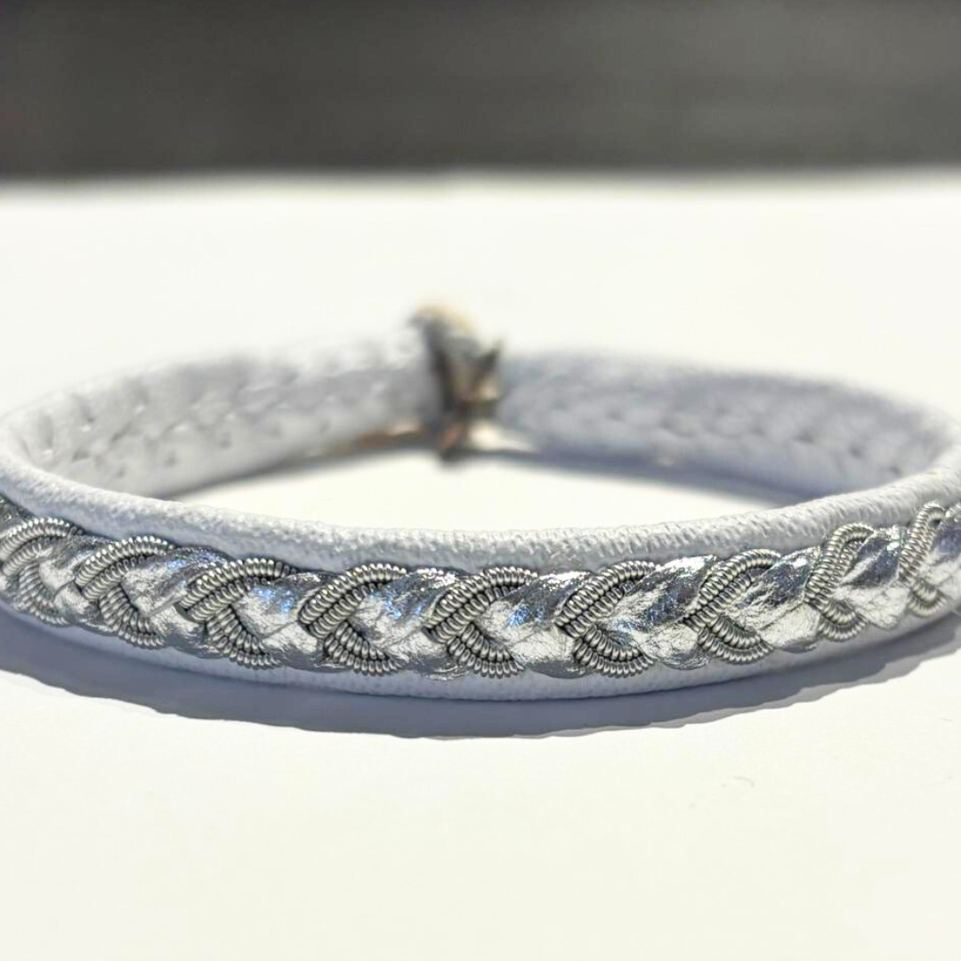 The Anita White/Silver bracelet features delicate pewter embroidery on soft reindeer leather with a horn button closure. Beautiful worn alone or stacked with your favourite pieces.