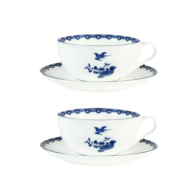 A set of 2 porcelain tea cups and saucers designed by &K for the Rijksmuseum Amsterdam, featuring Delft Blue birds and floral motifs inspired by 17th-century Dutch pottery. Size: 250ml